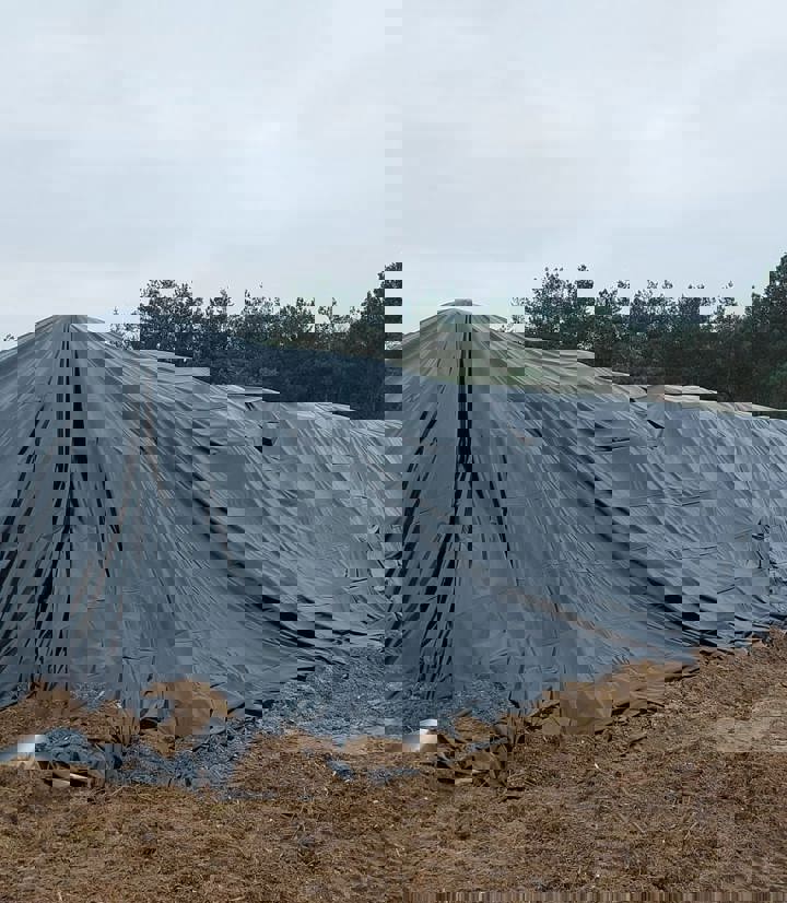 Sinds eind oktober ligt er een hoop van zo’n driehonderd kuub in het Park, afgedekt met zeil. Onder het zeil zit groenafval zoals maaisel, blad, versnipperde takken en plagsel. Deze groenresten zijn eerst met een machine kleingemaakt. Daarna zijn er microbacteriën en kalk aan toegevoegd. Vervolgens is de hoop zo goed mogelijk luchtdicht afgedekt.