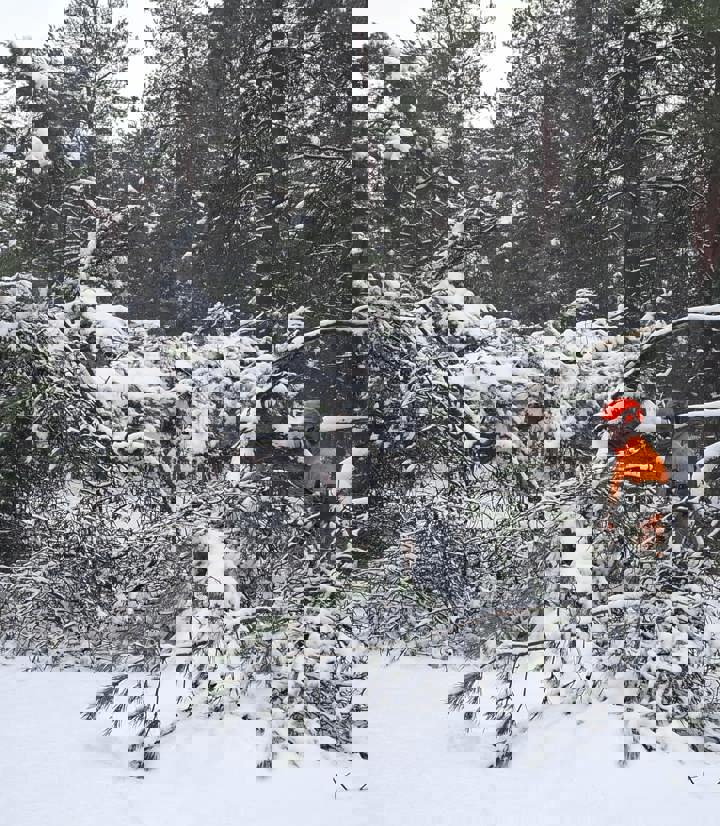 Naast gladheid is er nog een reden waarom een weg of pad soms niet gebruikt kan worden tijdens of na zware sneeuw of ijzel. Door het gewicht van de sneeuw of ijs knappen er boomtakken af, vooral bij grove dennen. En die kunnen gevaar opleveren. Behalve op wegen en paden kunnen er ook takken vallen op de in en rondom het Park de aanwezige rasters.