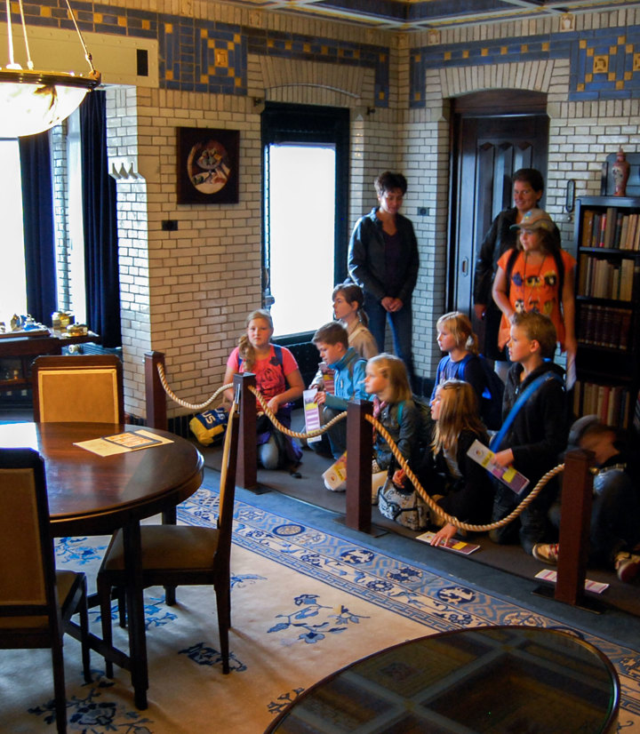 Je ziet een kleurig glas-in-lood raam in de hal en gekleurde tegeltjes op de vloer. Het huis was een gasthuis, dus er werd gelogeerd en gekookt. Daarom waren er ook dienstmeisjes aanwezig. Tijdens de kinderrondleiding wordt verteld over de legende van Hubertus, de geschiedenis van het Jachthuis, de familie Kröller-Müller en de kunstverzameling. De verklede rondleiders spreken tot de verbeelding, de butler van het echtpaar vertelt je meer over hoe het leven in het Jachthuis er aan toe gaat. En wellicht kom je nog wel meer bewoners van het Jachthuis tegen.