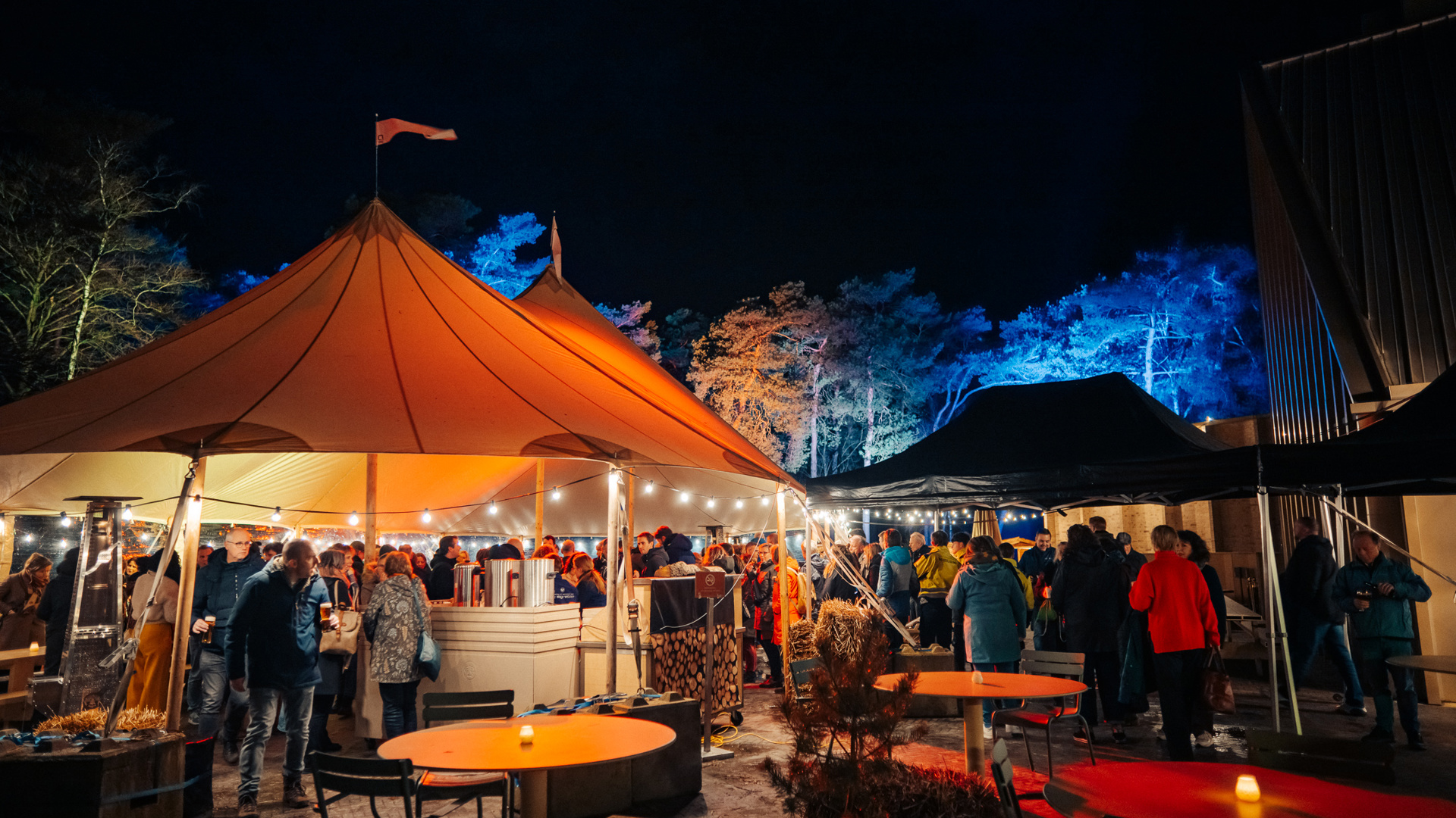 Kom helemaal in winterse sferen op het Hoge Veluwe Winterterras. Ons Winterterras is sfeervol versierd met lampjes, houten kramen en vuurkorven waarbij je lekker warm kunt zitten. Vanuit de houten kraampjes worden winterse versnaperingen geserveerd, zoals stoof van edelhert en wild zwijn, een soepje van geroosterde pompoenen uit eigen moestuin, broodje hamburger van de barbecue en bockbier van de tap. Van 29 oktober 2026 tot en met 31 januari 2027 kun je samen met je collega's genieten van een compleet verzorgd arrangement.